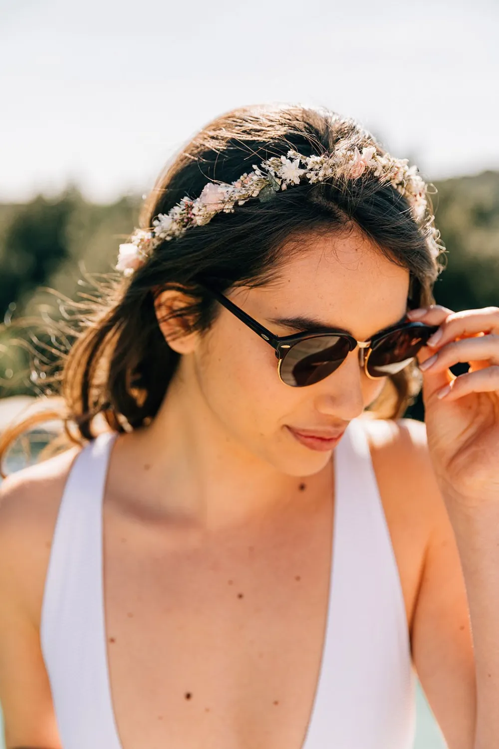 Cette fine couronne de petites fleurs aux tons pastels et agrémentée de quelques touches de feuillage est l’accessoire idéal pour orner un joli wavy. Délicate et intemporelle, cette couronne ornera aussi bien la coiffure des mariées que celle des invitées et pourra être reportée tout l’été avec une jolie robe fleurie. Composition : fleurs de gypsophile et tatarica blanches stabilisées, feuilles d’eucalyptus, bruyère rose et fleurs d’hortensia rose poudre stabilisées. Durée de conservation : les fleurs qui composent cette couronne sont éternelles.
