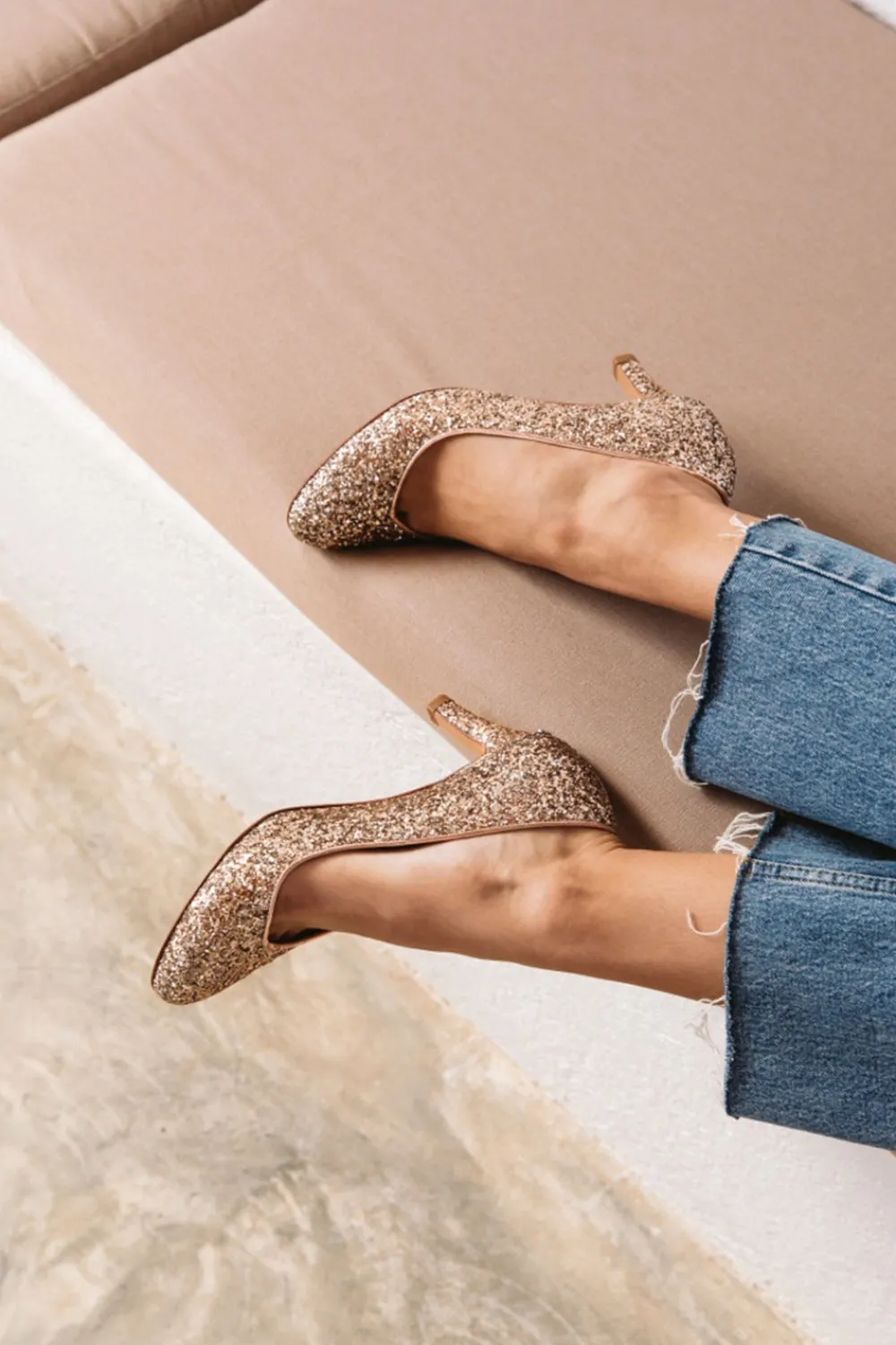 – Talon enrobé en paillettes : 6,5 cm