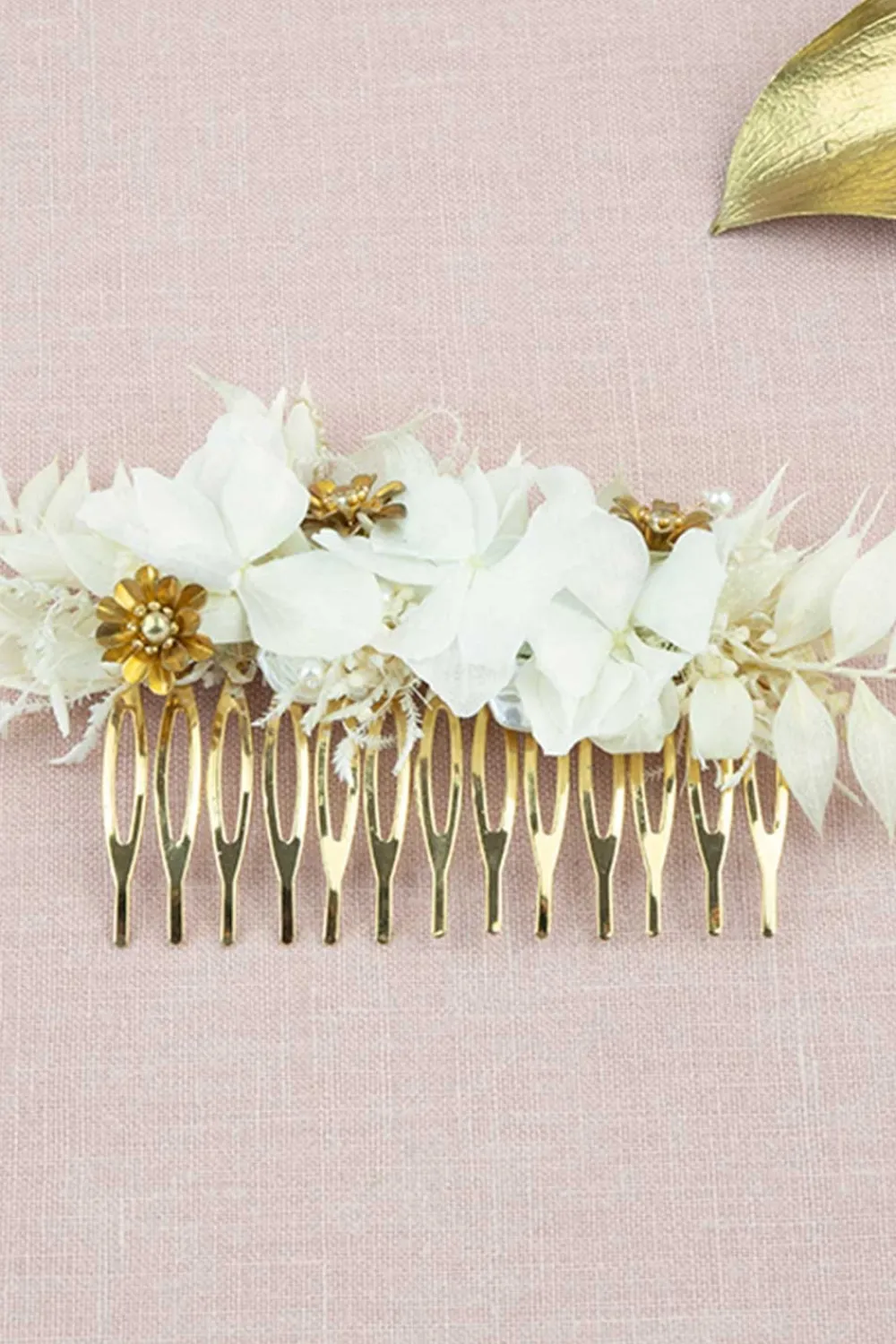 Avec ses petites fleurs d’hortensia, de ruscus et ses autres petites fleurs blanches stabilisées, le grand peigne Adriana joue sur la subtile alliance des fleurs, des perles et des fleurs en métal doré pour constituer l’accessoire bohème et romantique par excellence.