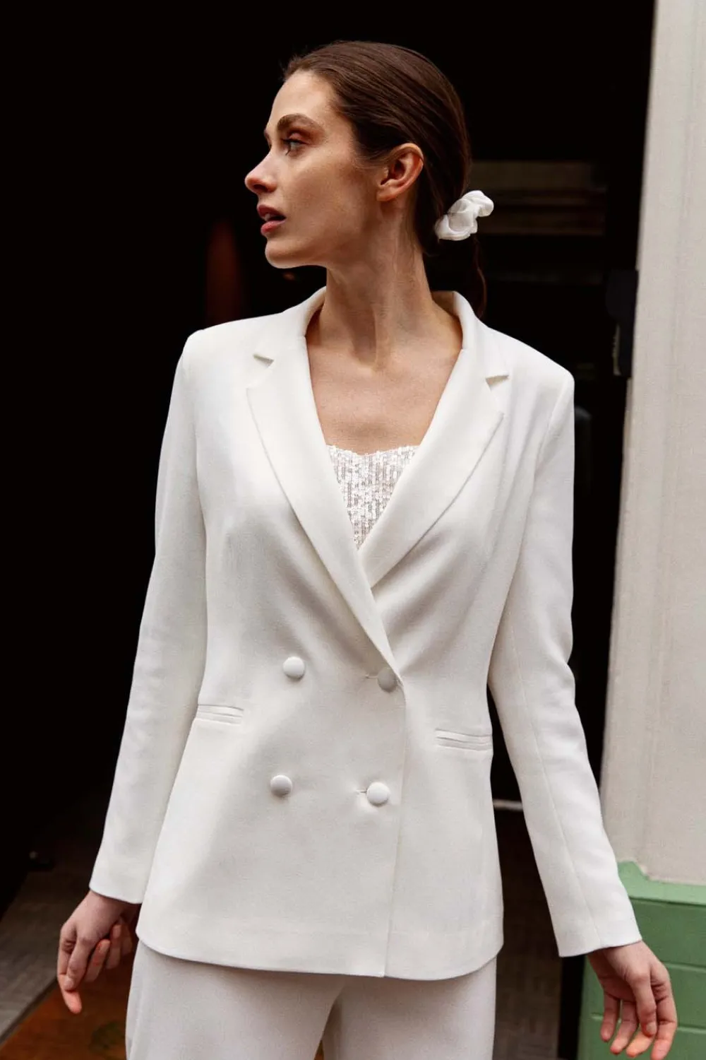 – Fermeture croisée au devant, grâce à 4 boutons recouverts en tissu principal