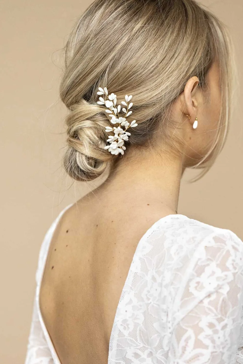 Le demi peigne Roma est un accessoire cheveux en porcelaine froide aux multiples détails montés sur un fil plaqué Or. Incarnation parfaite du romantisme à l’italienne, ce peigne cheveux est l’accessoire qui vous fera briller. Chaque branche est entièrement réalisée à la main dans les Ateliers Maison Massillon dans le sud de la France.