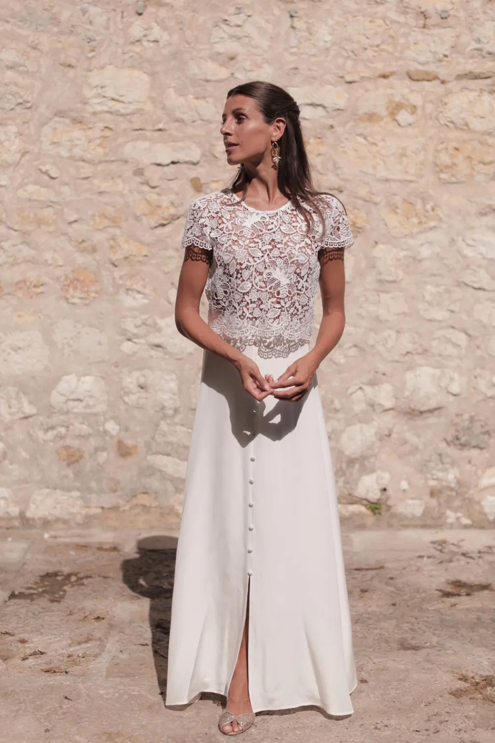 – Boutonnage de 5 boutons ronds recouverts en tissu blanc cassé