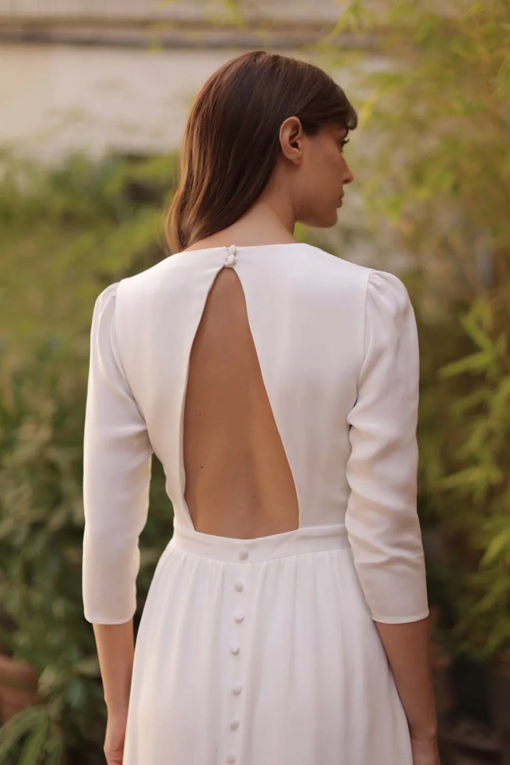– Faux boutonnage de 17 boutons ronds recouverts en tissu principal le long de la couture milieu dos sur le bas de la robe