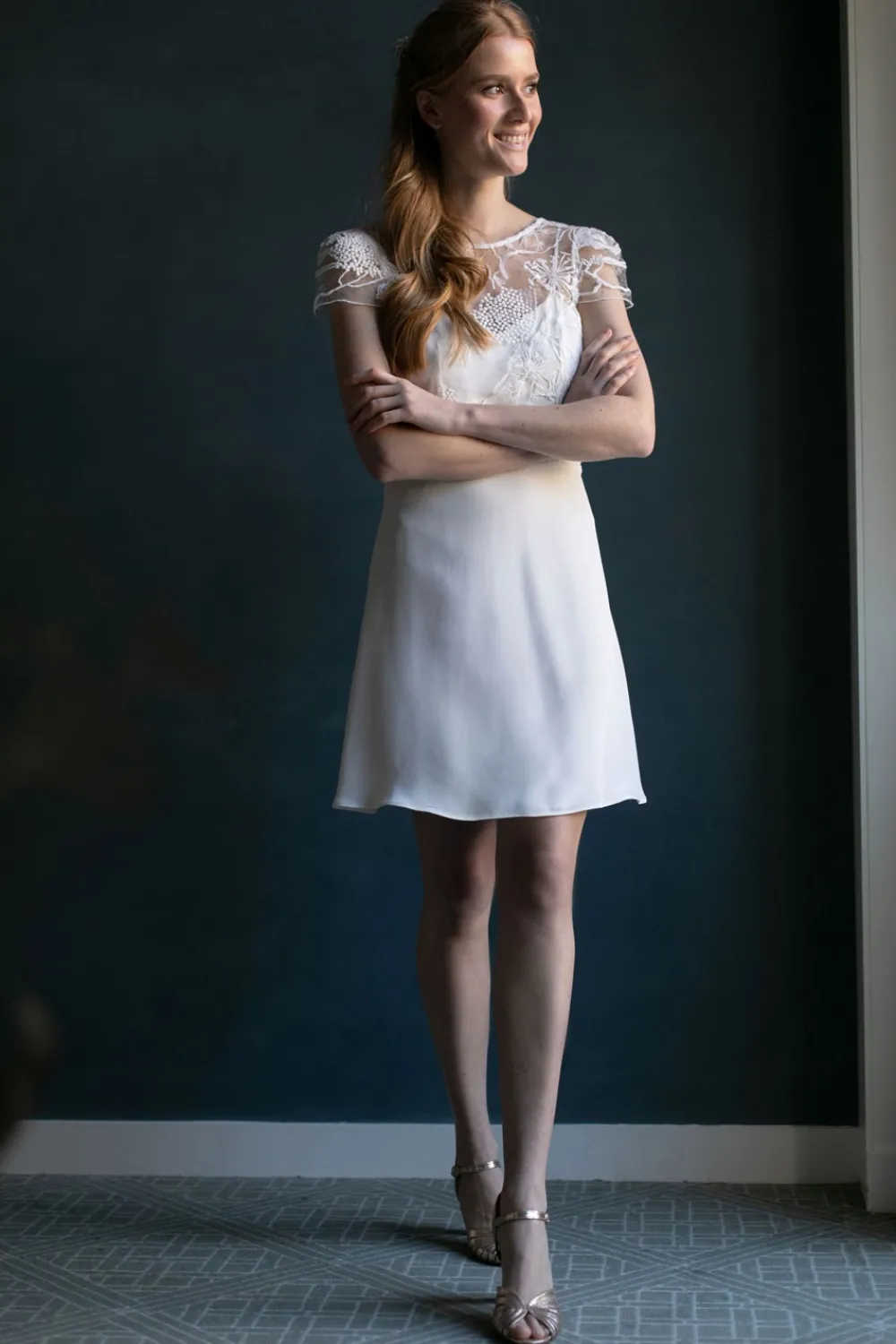 – Robe courte, en crêpe de soie blanc cassé et détails de dentelle tulle brodé