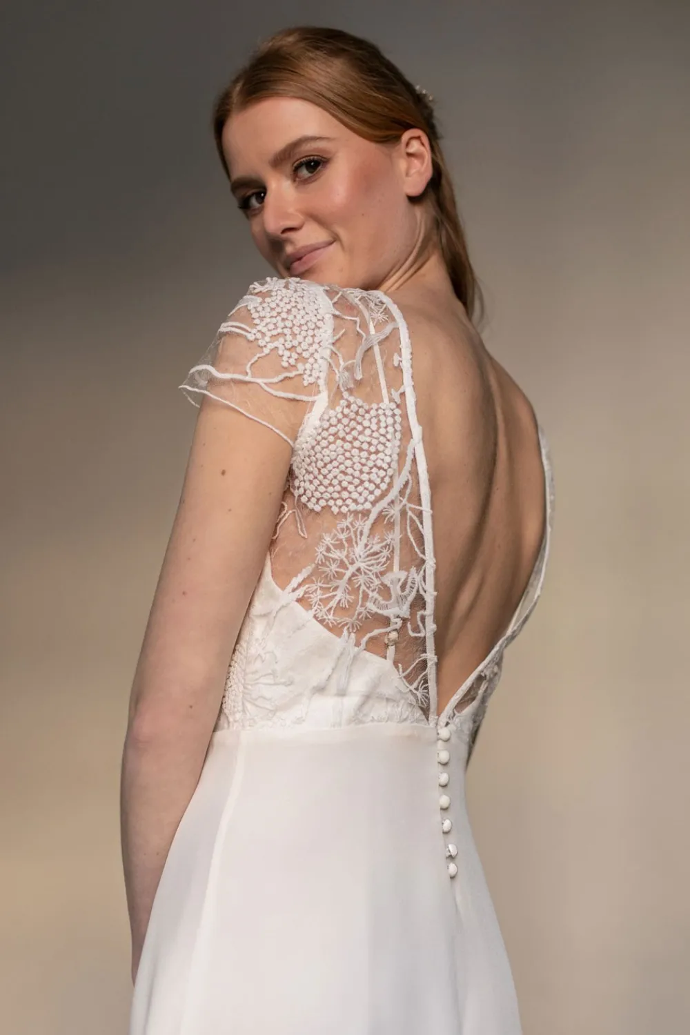 – Décolleté légèrement cœur, visible en transparence sous la dentelle à encolure ronde au-devant