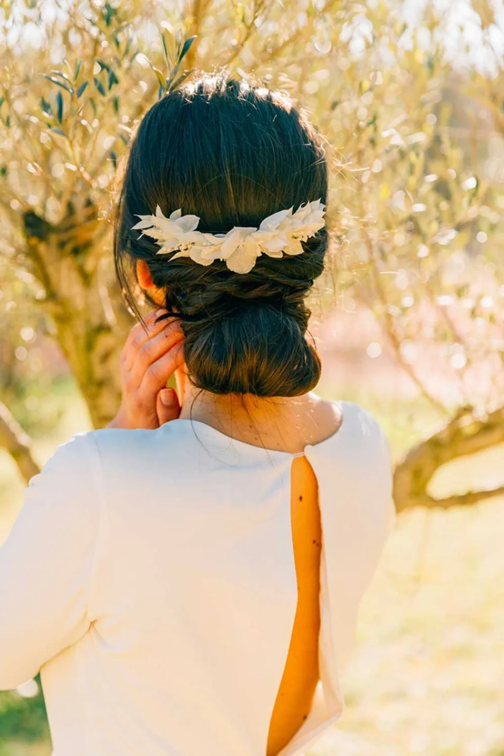 Composition : feuilles de ruscus, fleurs de gypsophile et fleurs d’hortensia blanches. Taille : 15 cm environ. Les fleurs et feuilles qui composent ce double peigne sont éternelles.
