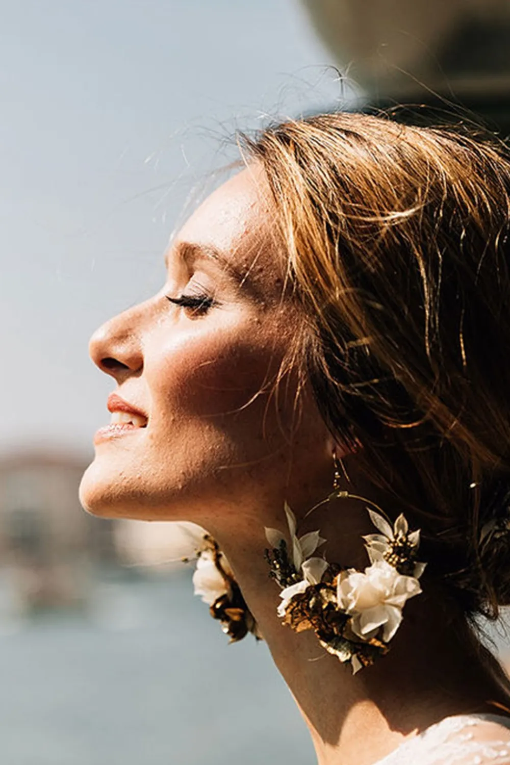 Avec leur subtil mélange de blanc et d’or, les boucles Graziella jouent sur l’asymétrie pour habiller votre silhouette d’une véritable pièce maitresse. L’accessoire idéal pour une mariée moderne et féminine. Composition : fleurs d’hortensia et feuilles de ruscus stablisées blanches et or, structure plaquée or. Durée de conservation : les fleurs qui composent ces boucles d’oreilles sont éternelles.