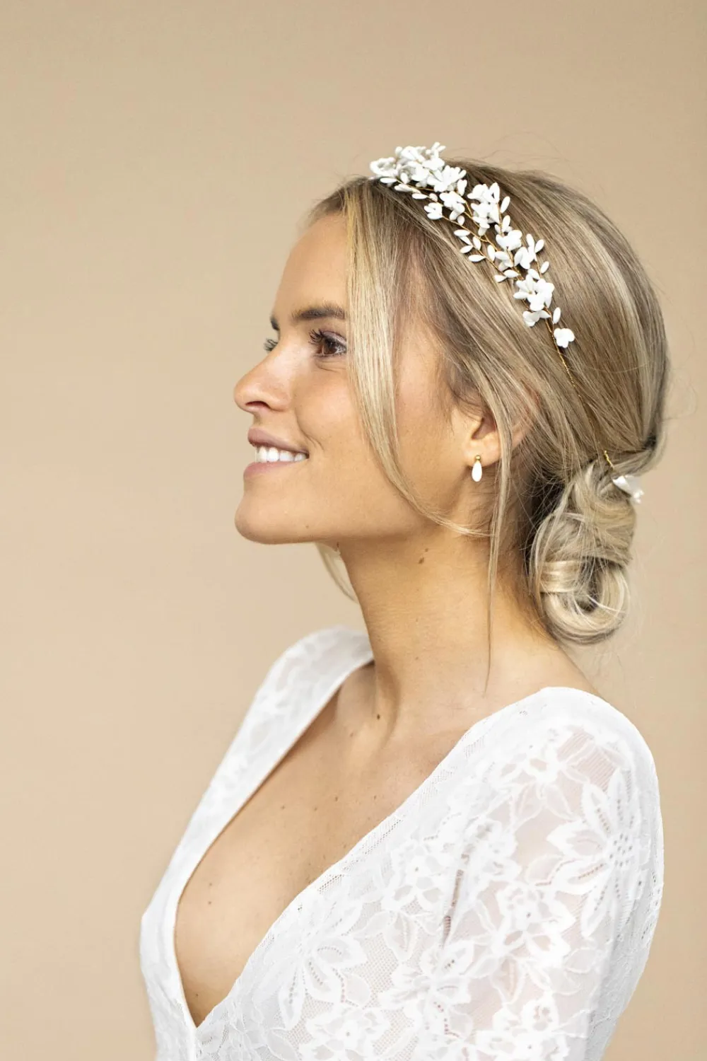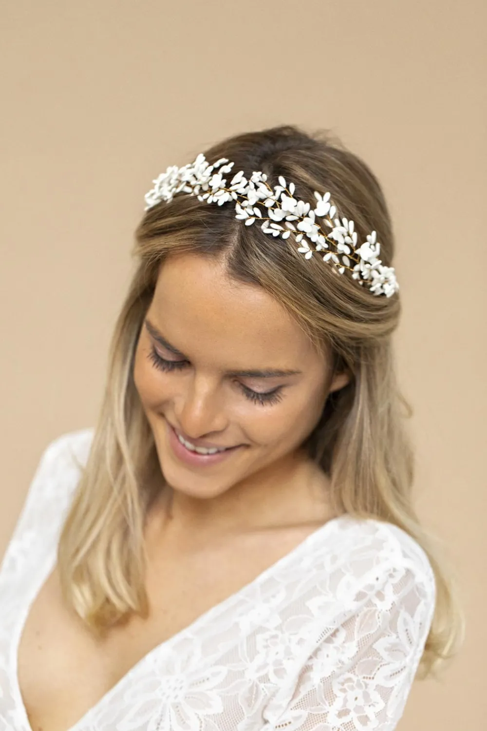 Rayonnez pour le plus beau jour de votre vie et incarnez la classe et le romantisme à l’italienne avec Roma, la couronne aux innombrables boutons de fleurs signés Maison Massilon. Roma est une couronne de porcelaine froide aux multiples détails montée sur un fil plaqué Or. Chaque branche est entièrement réalisée à la main par la créatrice et nécessite pas moins de 15h de travail dans son atelier. Collection « Je t’aime à l’italienne ».
