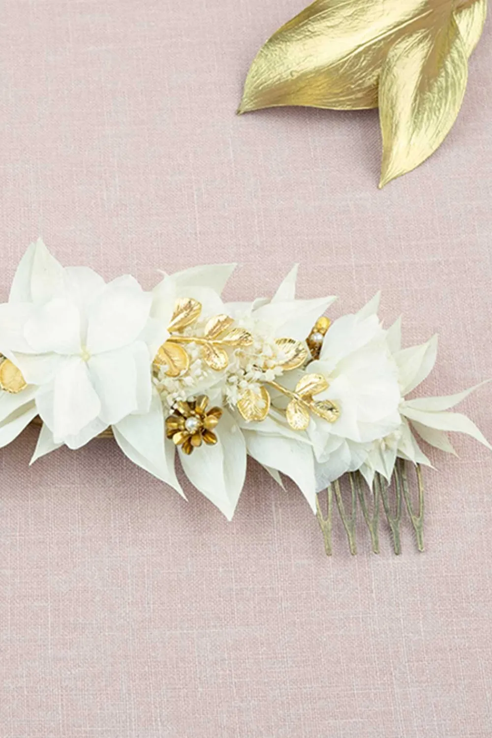 Ce peigne allie de subtiles et délicates fleurs de ruscus et d’hortensia blanches stabilisées à des fleurs et des feuilles en métal doré.
