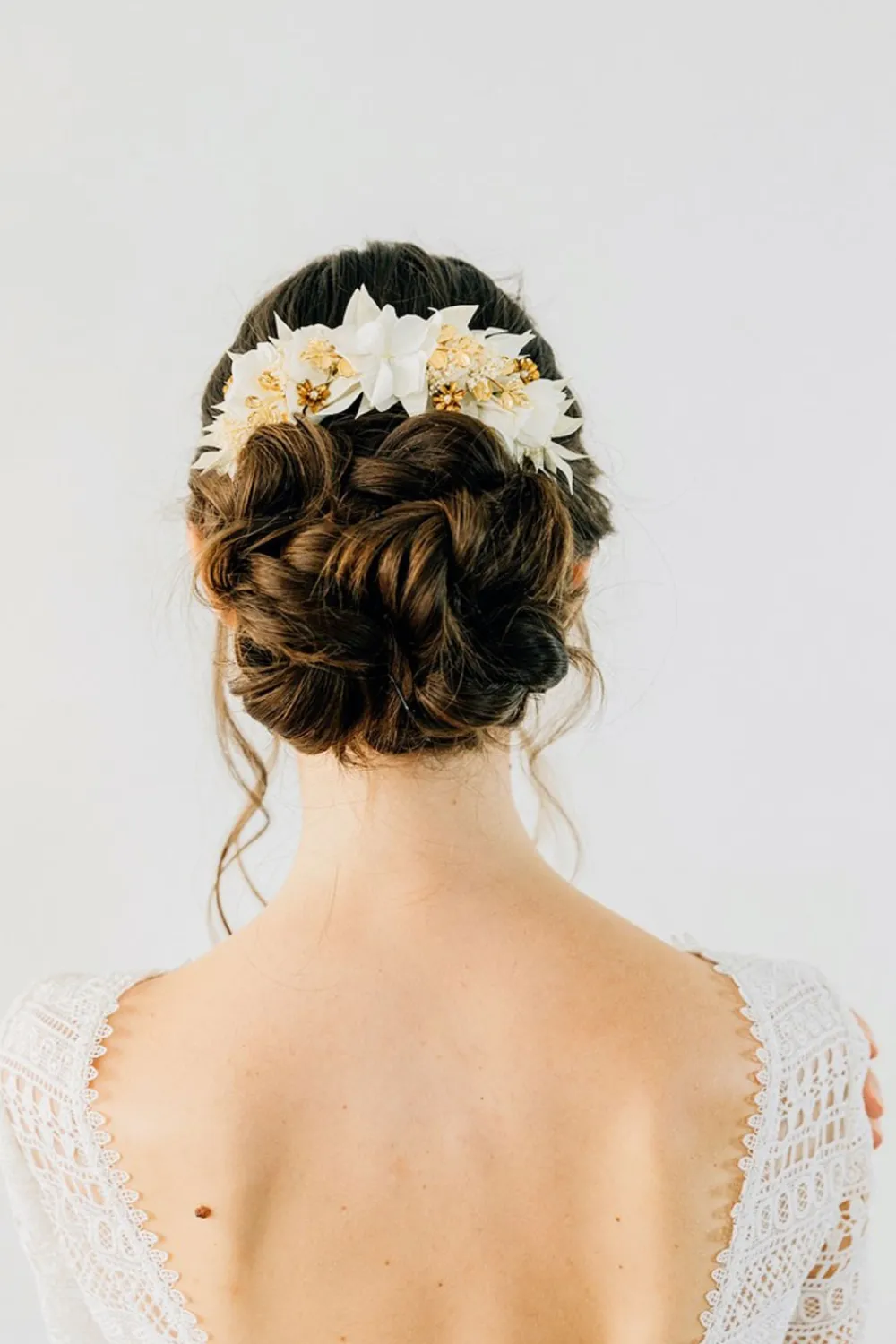 Le double peigne Carla : alliance subtile et délicate de fleurs de ruscus et d’hortensia blanches stabilisées avec des fleurs et des feuilles en métal doré.