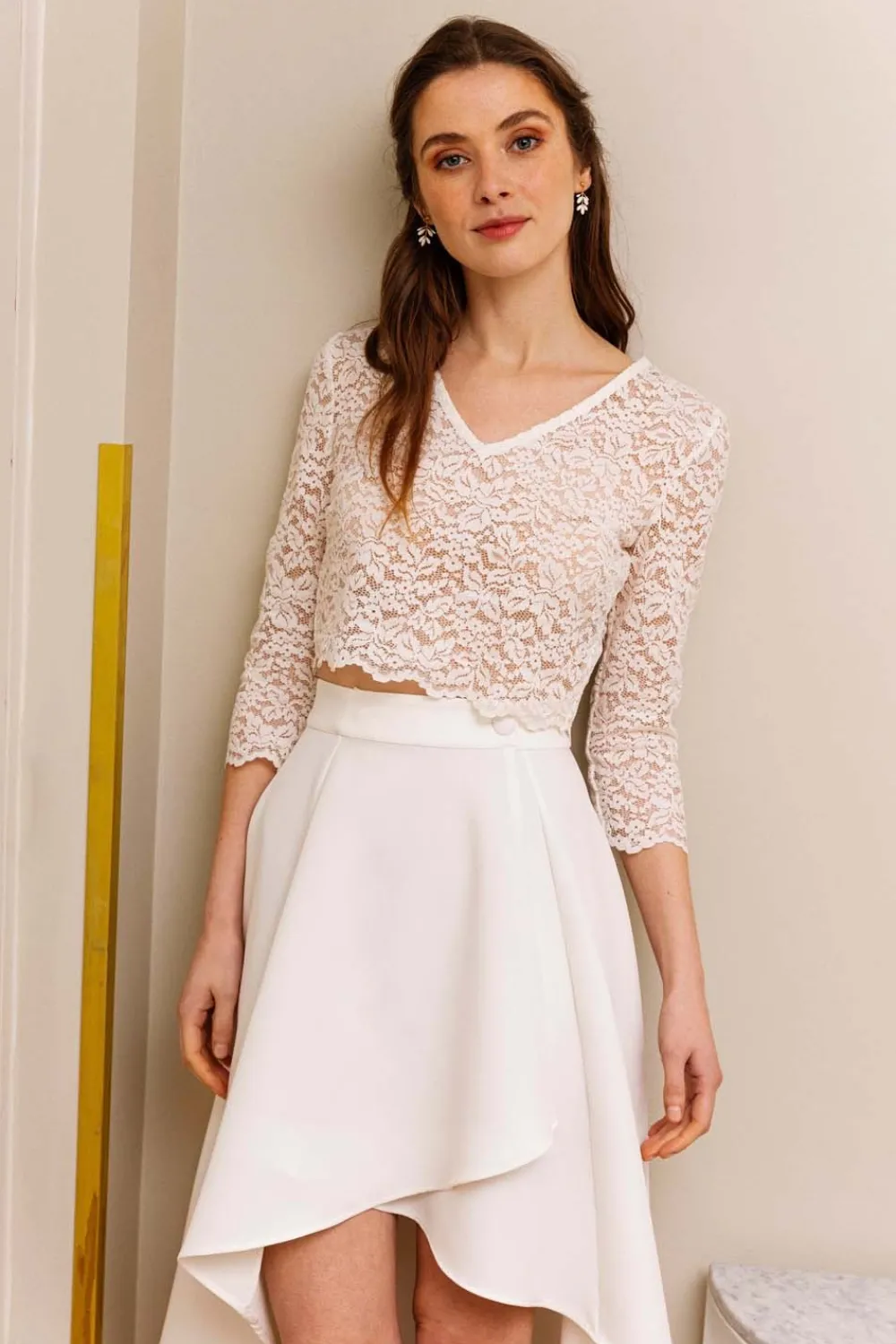 – Haut court en dentelle blanc cassé, finitions festonnées et motif petites fleurs