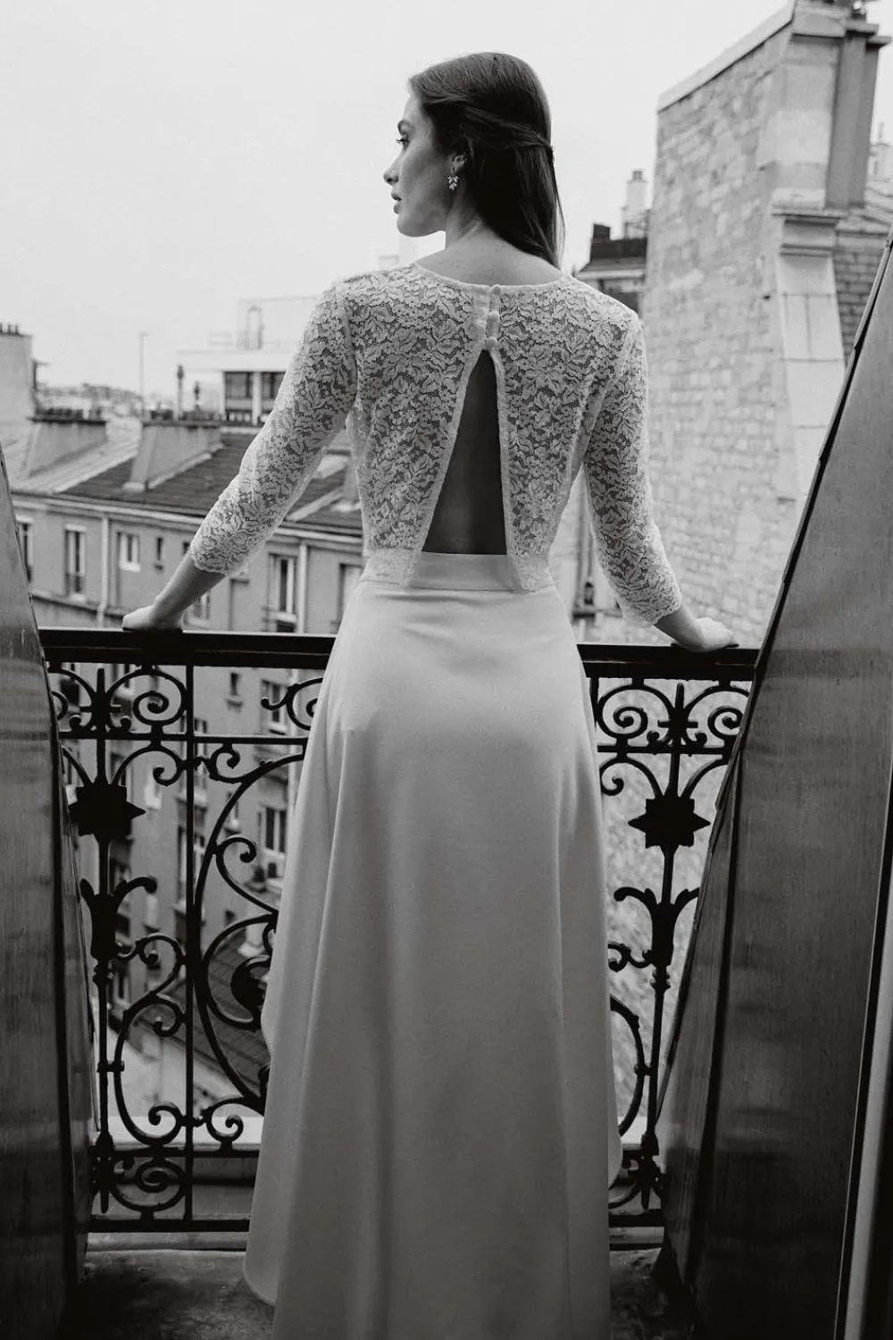 – Ouverture grâce à un boutonnage en haut milieu dos de 3 boutons recouverts en tissu blanc cassé