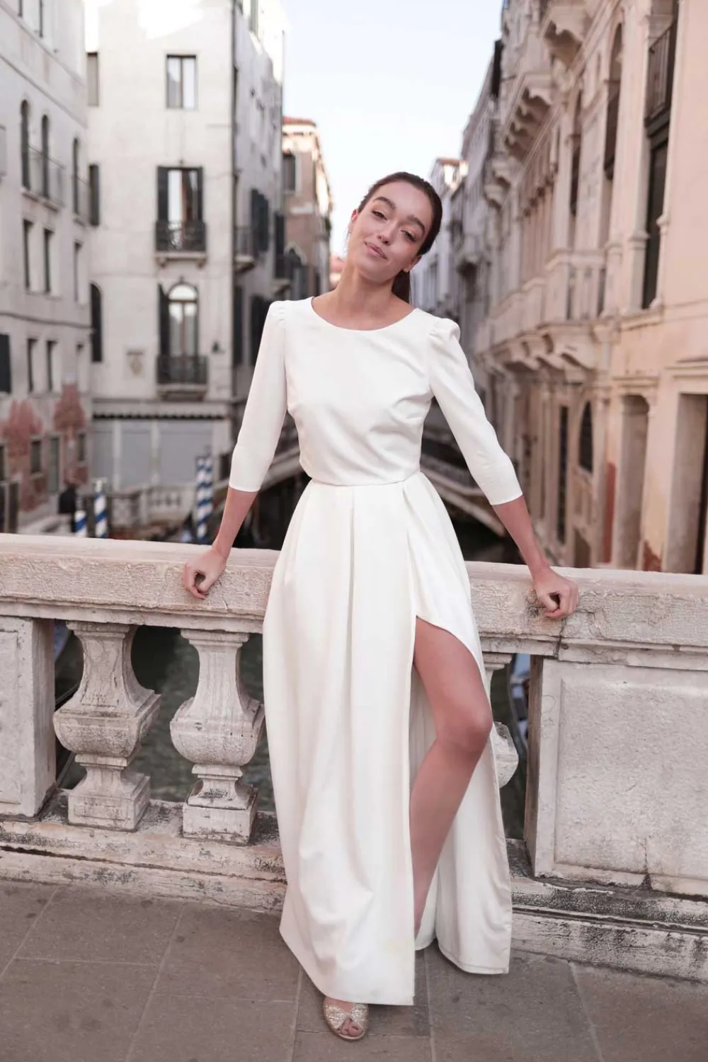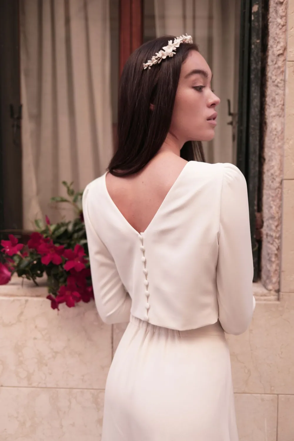 – Ouverture dos à 7 boutons ronds blancs recouverts en tissu