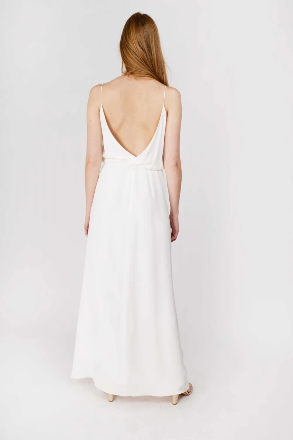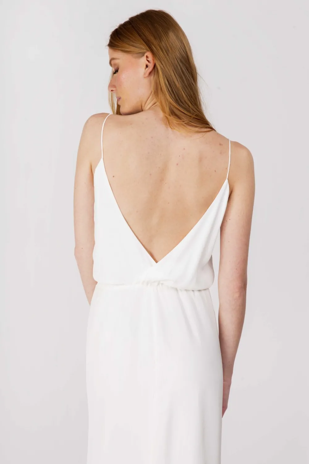 Robe longue en drap de soie écru, à fines bretelles. Le décolleté devant est en V. Au dos, les deux pans du haut de la robe se croisent, offrant ainsi un grand dos nu. Le tissu est blousant au niveau de la taille élastiquée. Le bas de la robe présente à gauche une fente d’environ 60 cm. Le bas est fluide et droit, avec finitions ourlets mouchoirs. Matière principale : 100% soie. Robe entièrement doublée : 100% voile de viscose écru. Nettoyage à sec. Fabriquée en Europe. La robe Julie se porte avec les hauts en dentelle Julia, ou encore Madeleine.